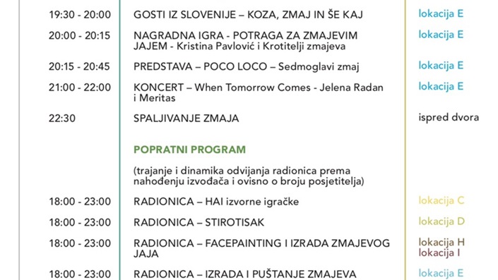 Upoznat ćete te, kroz predavanje i projekcije, sa simbolikom i značajem zmajeva u narodnim pričama, gledat ćete predstave u kojima se junaci susreću sa zmajevima, kročit ćete kroz Veliki Tabor lica oslikanih zmajskim simbolima, otiskivat ćete vlastite zmajske tragove, pronalaziti zmajska jaja, jesti zmajske odreske, izrađivati leteće zmajeve, pjevati s Jelenom Radan i grupom Meritas, u društvu zmaja od drveta, zmaja od pjene i zmaja od slame. Ako ostanete u Dvoru dovoljno dugo, vidjet ćete i kako vatra guta upravo onog zmaja koji vatru riga. I to nije sve! Za cjeloviti doživljaj uputite se u Veliki Tabor, 24. kolovoza 2019. na drugi LegendFest.
