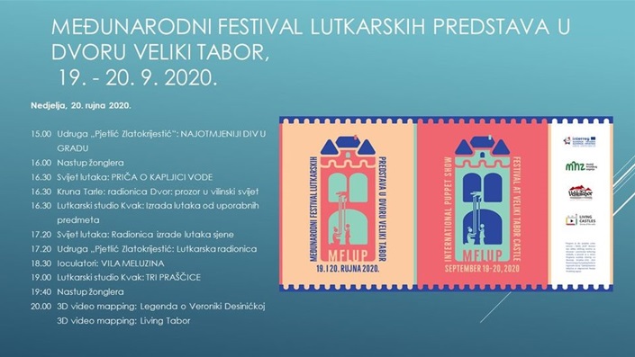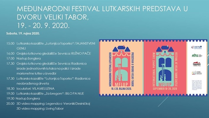 U prostoru Dvora Veliki Tabor, ove će se godine po prvi puta održati Međunarodni festival lutkarskih predstava. Posjetite nas u subotu i nedjelju 19. i 20. rujna 2020. g. od 15 do 20 sati i uživajte u bogatom programu lutkarskih predstava i radionica.