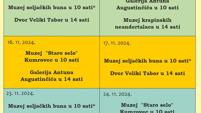 Važno je napomenuti da će se radionice Muzeja seljačkih buna (Samci 64, Gornja Stubica), koji je zbog obnove zatvoren za posjetitelje, prema rasporedu održavati u prostorima Dvora Veliki Tabor (Hum Košnički 1, Desinić).