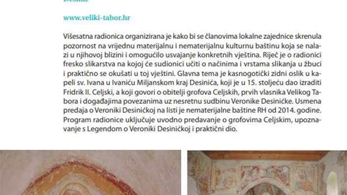 U okviru Dana europske baštine u Dvoru Veliki Tabor organizira se radionica zidnog slikarstva. Radionica je besplatna, vodit će ju konzervator-restaurator iz Hrvatskog restauratorskog zavoda, Matija Deak, a trajat će od 10 do 14 sati.