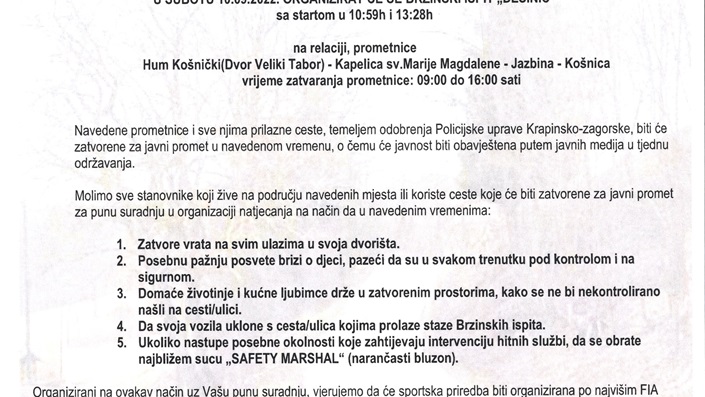 U subotu 10.09.2022. godine u sklopu 11. Rally Kumrovec organizirat će se brzinski ispit “Desinić” sa startom u 10:59 h i 13:28 h na relaciji, prometnice
