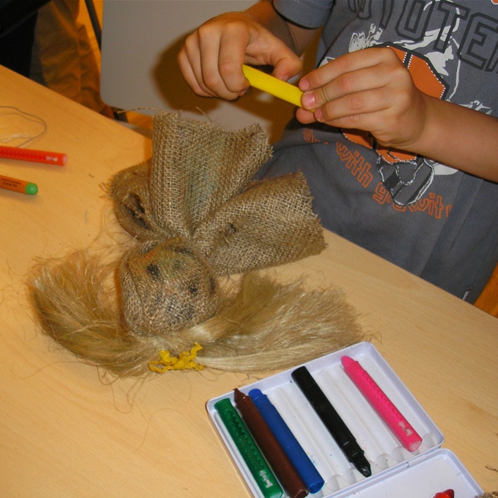 Otroci izdelajo avtorsko lutko ginjol iz jute, konoplje in vrvice.